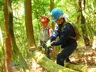 1日目は、水源を涵養する森の間伐、下草刈りなどの